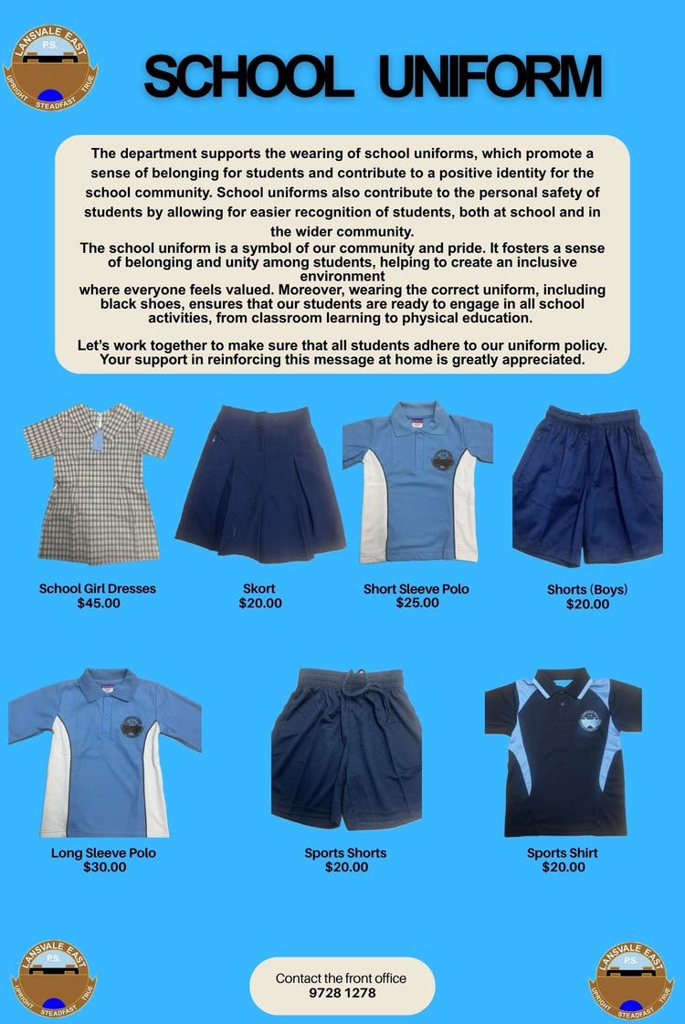 At Lansvale East Public School, wearing a uniform is a proud tradition that brings our students together. Our school uniform represents unity, equality, and respect—values that shape our learning community every day. When everyone dresses alike, it helps us focus on what really matters: learning, friendship, and teamwork. Uniforms also make it easier to identify our students, keeping our school safe and welcoming for all.